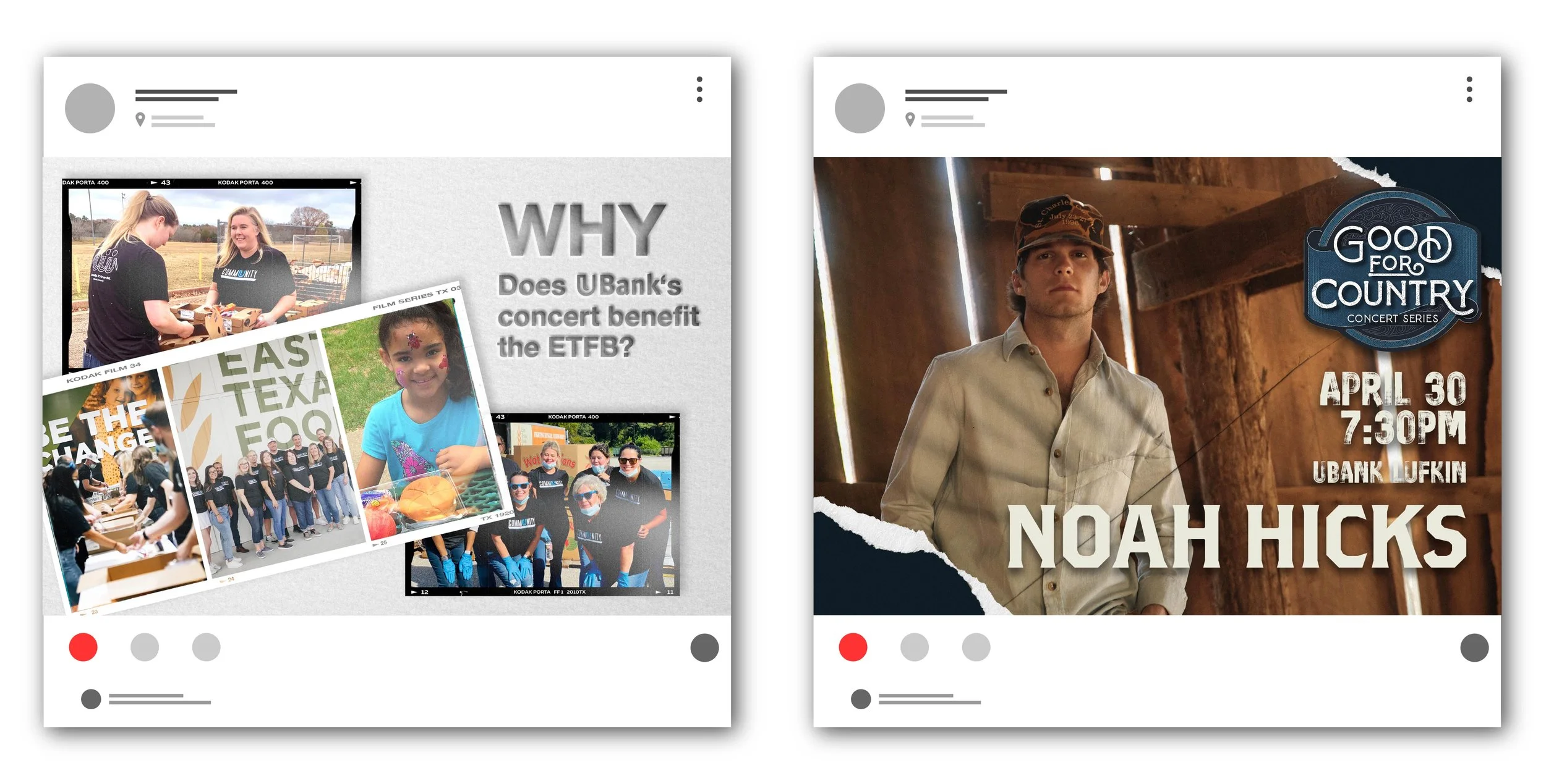 Born out of a post-COVID need for uplifting entertainment and financial support in the Angelina county community, UBank’s first Good For Country concert took place in November of 2020, with plans to make this an annual event. UBank is always looking for creative ways to support the local community, and all proceeds going to the East Texas Food Bank. The 2021 Good For Country concert will take place on May 15th, with Kameron Marlowe headlining the show and The Chad Cooke Band opening.